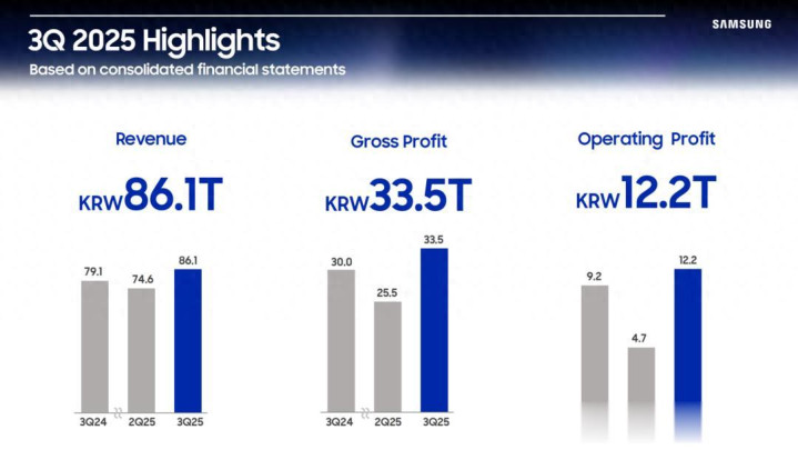 三星公布其2025年第三季度财报,收入为86.1万亿韩元,与上一季度相比增长 15.4%。内存业务的季度销售额也创下历史新高,这主要是由于人工智能势头增强,对其HBM3E内存和服务器SSD的强劲需求推动了这一增长。此外,三星确认下一代HBM4内存样品已向全球客户发货,预计2026年将实现大规模生产。
